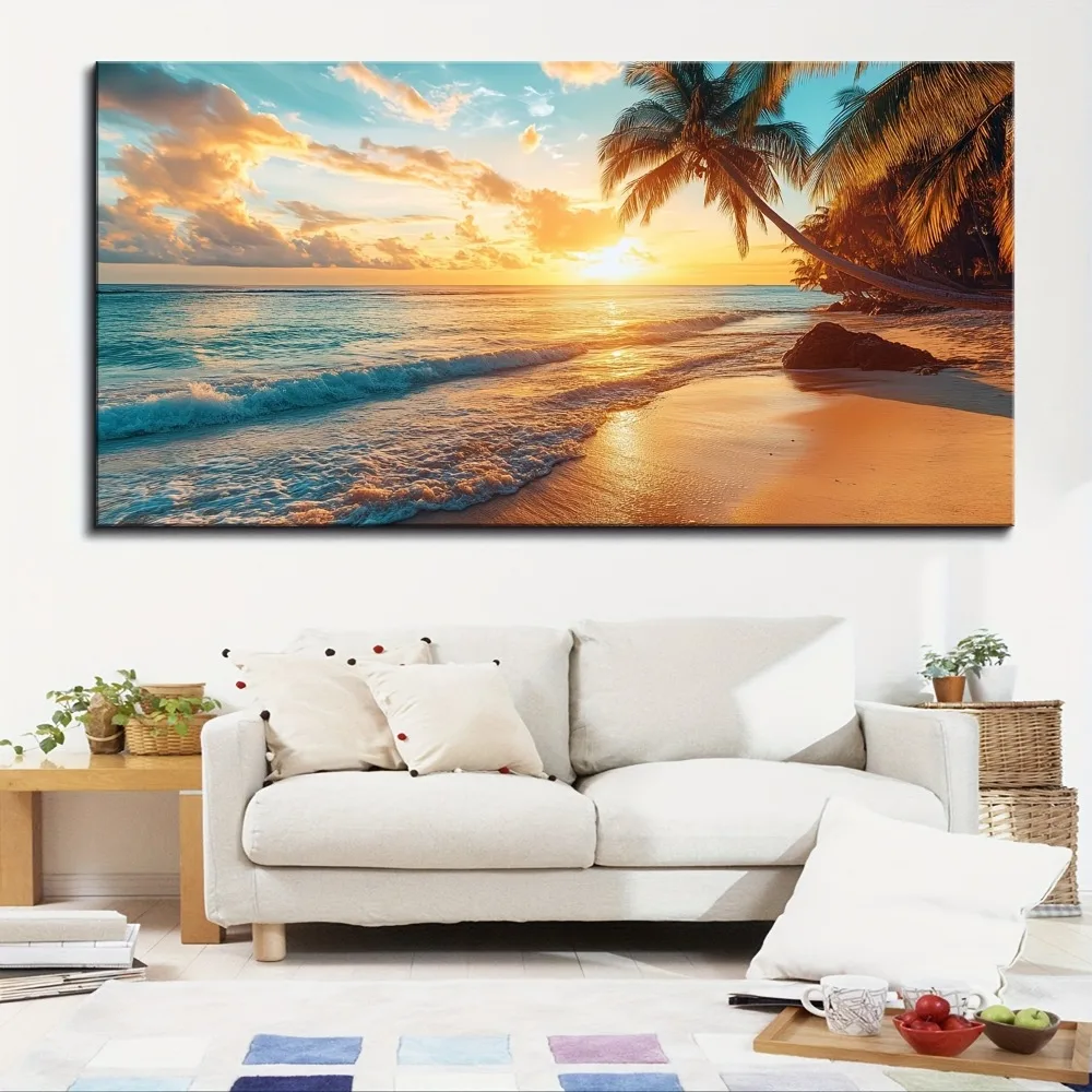 1.5 inch thick pine solid wood frame, natural scenery canvas mural, beach pictures, modern relaxing sunrise skyline painting