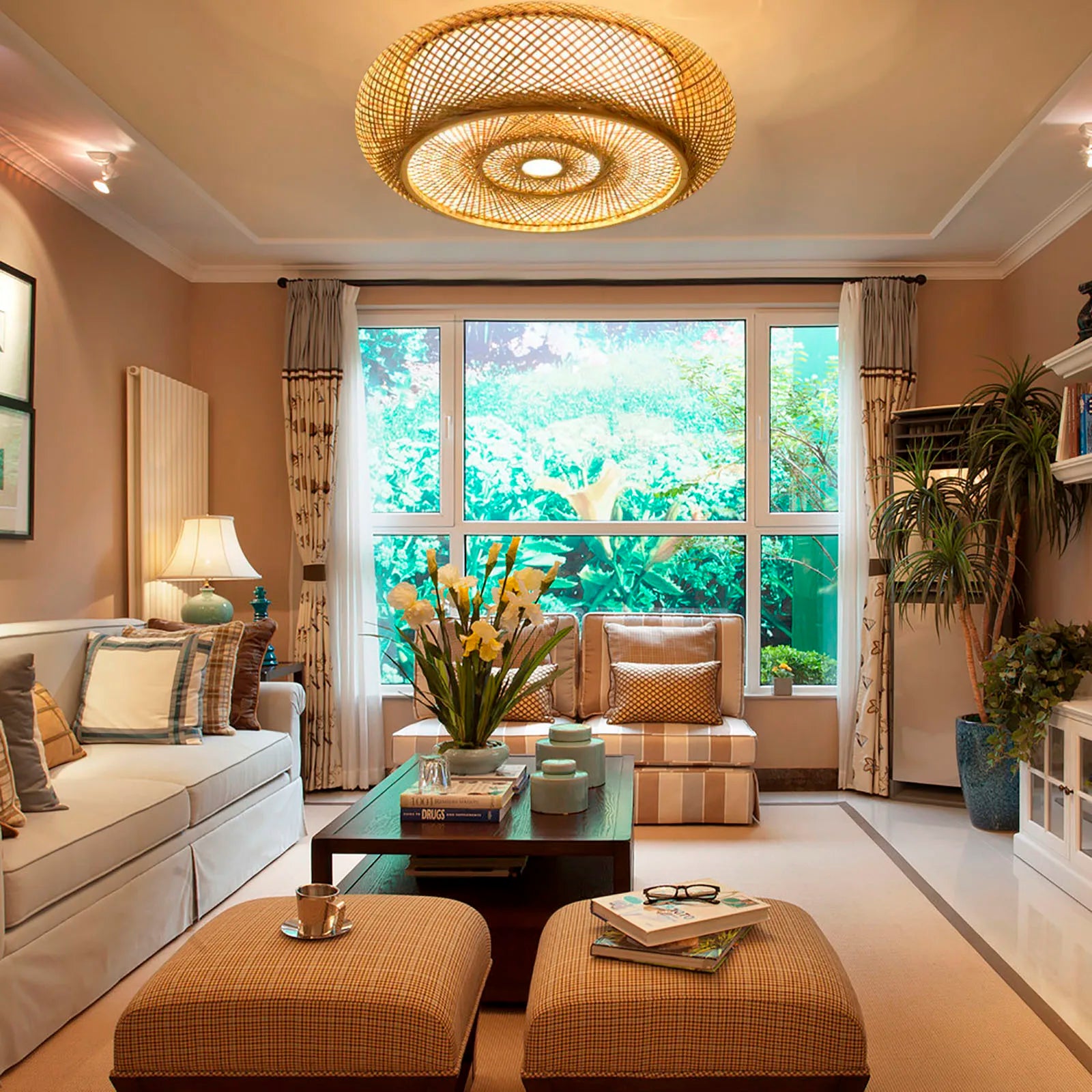 Asian Rustic Bamboo Flush Mount Ceiling Light 3-Lamp Antique Rattan Ceiling Light Weaving Lantern Lighting Fixture