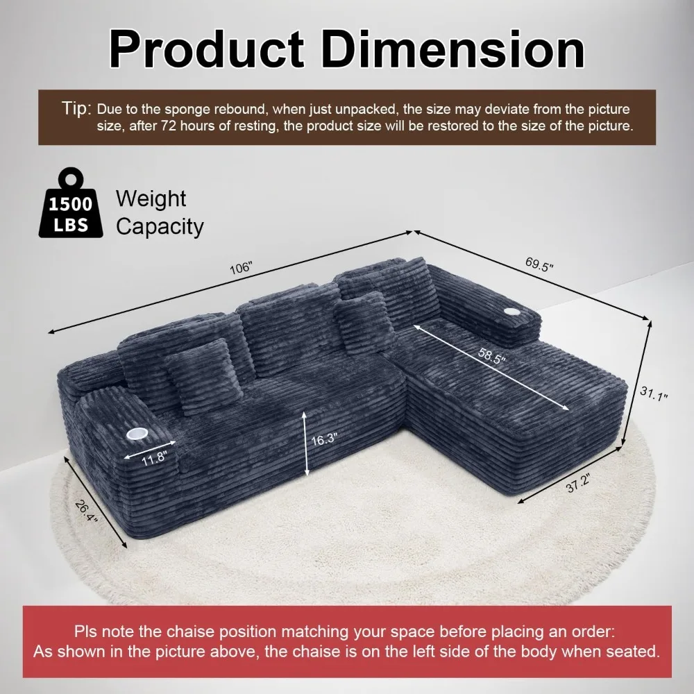 - 🚩🚩【As shown in the first image】When you're sitting on the couch, if the chaise (the extended lounging part) is on your right side, it's a right-arm chaise sofa; If it's on your left side, it's a left-arm chaise sofa. Note: After unpacking the compressed sofa from its sealed bag, let it rest for 48-72 hours (do not sit on it during this period). Wait until it fully expands and regains its plumpness (gentle patting can speed up this process) before installing the dual cup holders. Before installation, remove the black plastic cups from the exterior of the silver aluminum alloy cup holders.