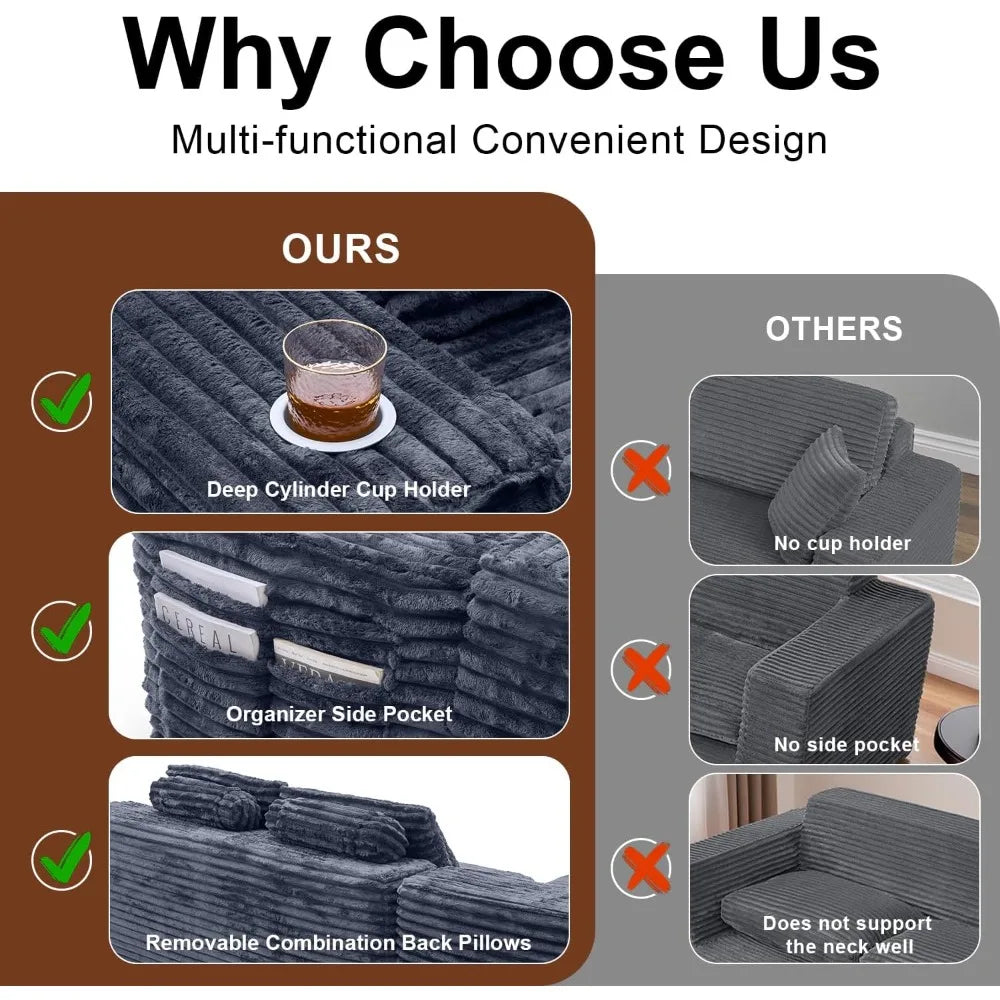 - 【Lazy Living Ready Design】Keep Essentials at Arm's Reach. Dual cup holders (secures 32 oz tumblers); Hidden corduroy pockets (fits 12.9" iPad + remotes); 6 detachable cushions (3 lumbar + 3 bolster pillows) for full chaise support. No more couch acrobatics - everything stays organized!