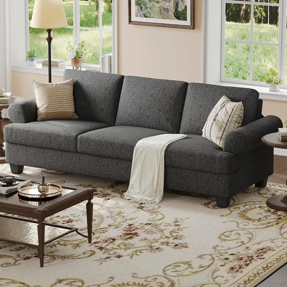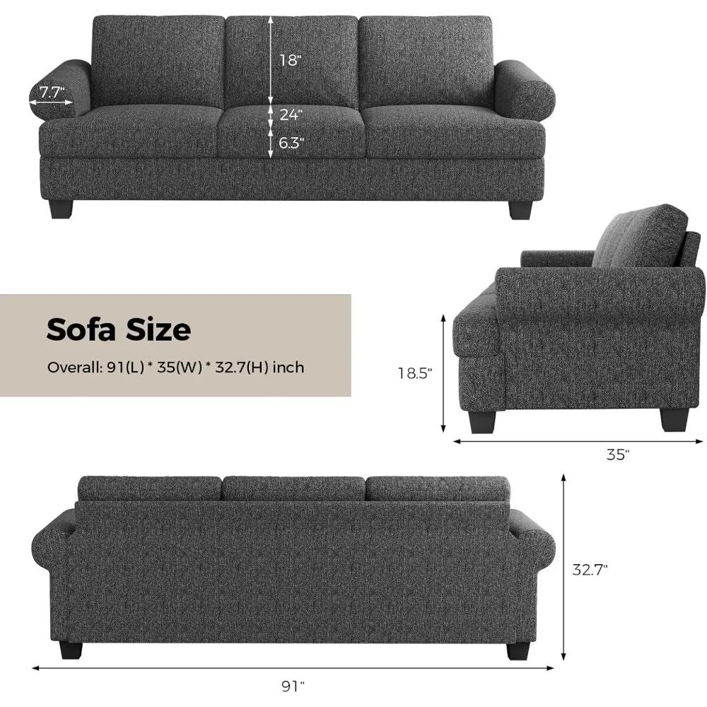 This product description highlights the features of the COPIEA 3-seater sofa, designed to enhance your quality of life and provide a comfortable seating experience. The sofa boasts a generous 24-inch seat depth, a movable backrest, and a plush seat cushion for optimal comfort. Measuring 91 inches by 32.7 inches by 35 inches, it is crafted from high-quality cotton and linen materials that offer a soft touch and are gentle on the skin. The sturdy frame, constructed from natural metal and wood, ensures the sofa's safety and durability while maintaining a comfortable seating experience. Conveniently, the entire sofa and all its parts are shipped in one package, making assembly a breeze. No tools are required, and it can be assembled by two people in approximately 15 minutes. The package, weighing 55 kilograms, has dimensions of 76 inches by 26 inches by 14 inches.
