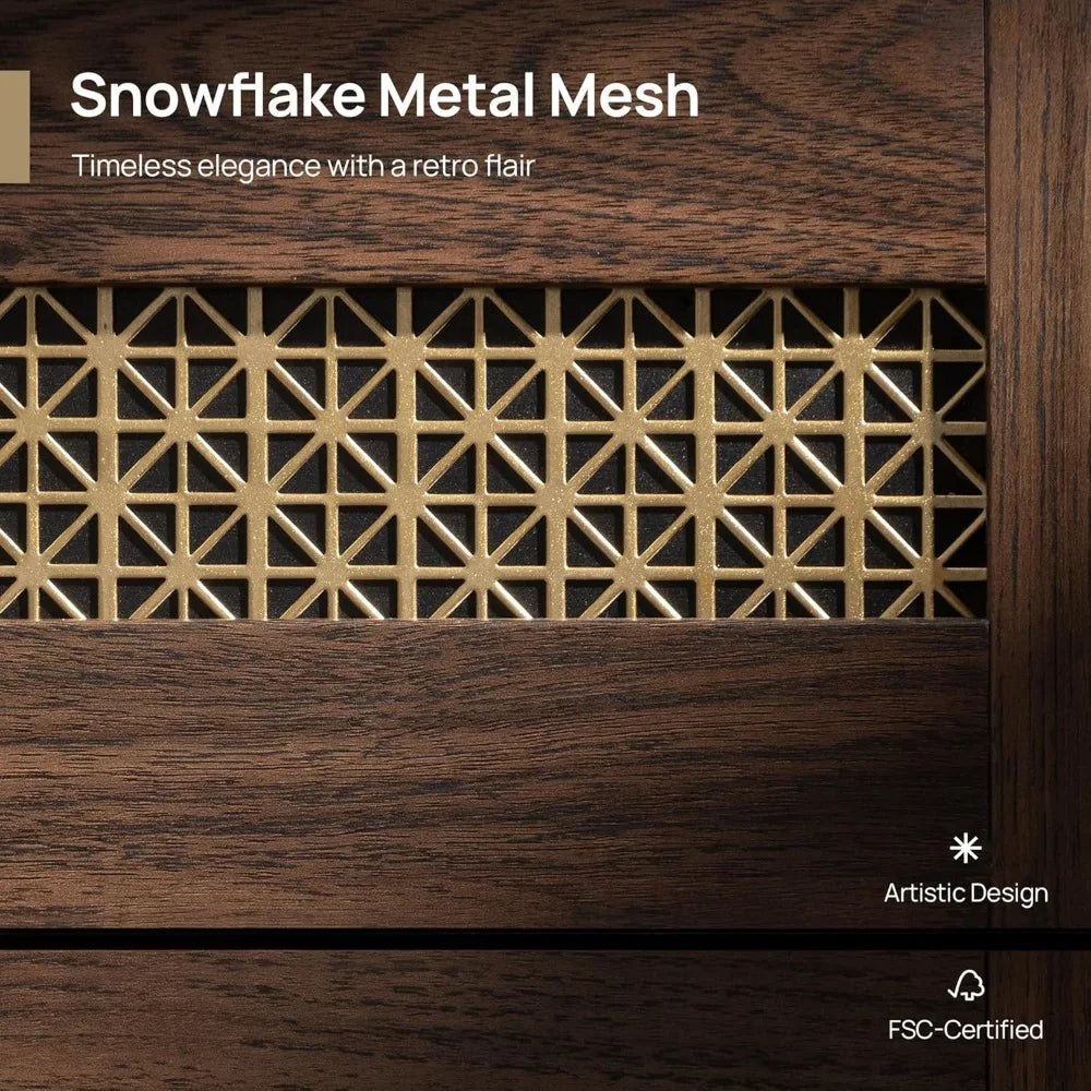 - 【Timeless Retro Aesthetic】 Infuse your space with a wave of nostalgia with this mid-century-inspired nightstand. Our night stand features eye-catching gold snowflake-inspired wire mesh drawer fronts and a walnut woodgrain finish. It blends vintage with modern style, adding a touch of charm to your space!