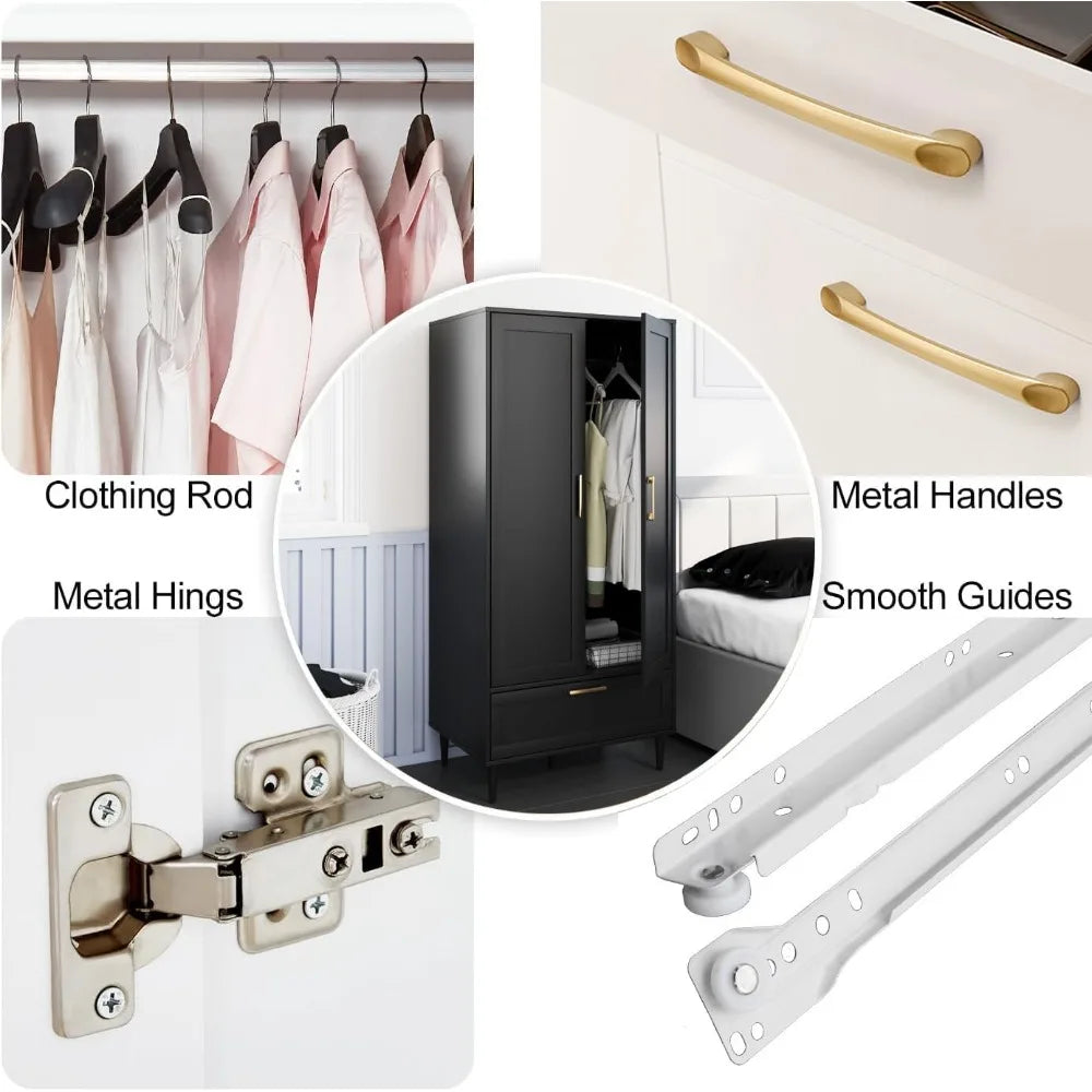 Modern Black Bedroom Armoire with Hanging Rod and Drawers, 60 Two-Door Storage Cabinet for Clothes