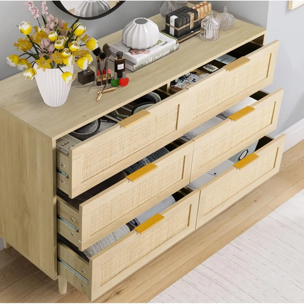 Rattan Dresser for Bedroom, Modern 6 Drawer Double Dresser with Gold Handles, Wood Storage Chest of Drawers fo Bedroom,Living Ro