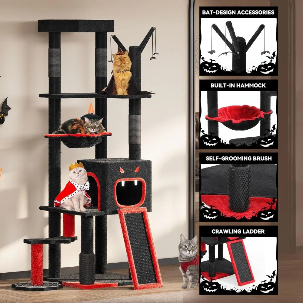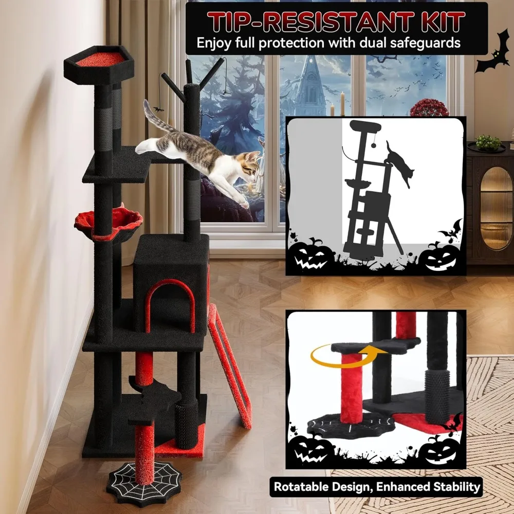 - Gothic Style Design: Featuring black and red plush fabric and a haunting design, this cat tower for indoor cats emanates a darker, more sophisticated allure; The feline furniture not only mesmerizes cat interest but also acts as a distinctive Halloween-themed home decor item
